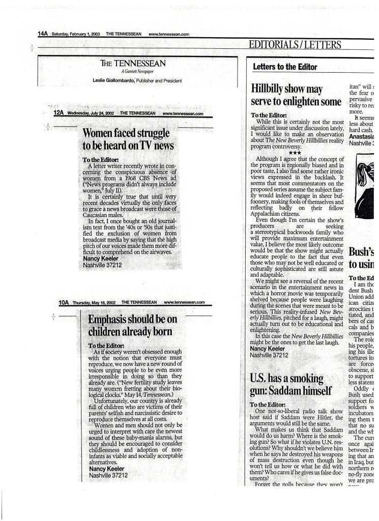 Just for a taste of all that, though, here’s a sample of my commentaries, in the form of three letters that were published by Nashville’s The Tennessean daily newspaper—this was back when newspapers were still thriving. The one on “The New Beverly Hillbillies” won me a “three star” distinction, which earned me a seat at the three star letter writers’ banquet. Woo hoo! I love to eat, and when I can eat and be honored for something at the same time, even better.